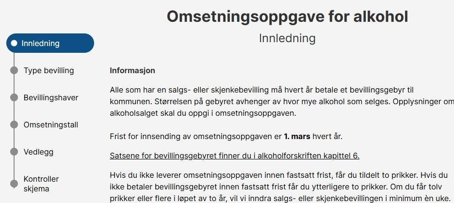 Husk å sende omsetningsoppgaven!Fristen er 1. mars. Hva er omsetningsoppgave? Alle som har en fast salgs- eller skjenkebevilling, må hvert år betale et bevillingsgebyr til kommunen. Hvor mye du må betale i gebyr avhenger av hvor mye alkohol du har solgt året før. Opplysningene om hvor mye alkohol din virksomhet har solgt oppgir du i omsetningsoppgaven.Det er lurt å sende innen fristen som er 1. mars, hvis ikke får du to prikker.Send inn omsetningsoppgaven Publisert av Bjørn Egil Gilje Publisert 23.02.2026 13.14 Sist endret 23.02.2026 13.17