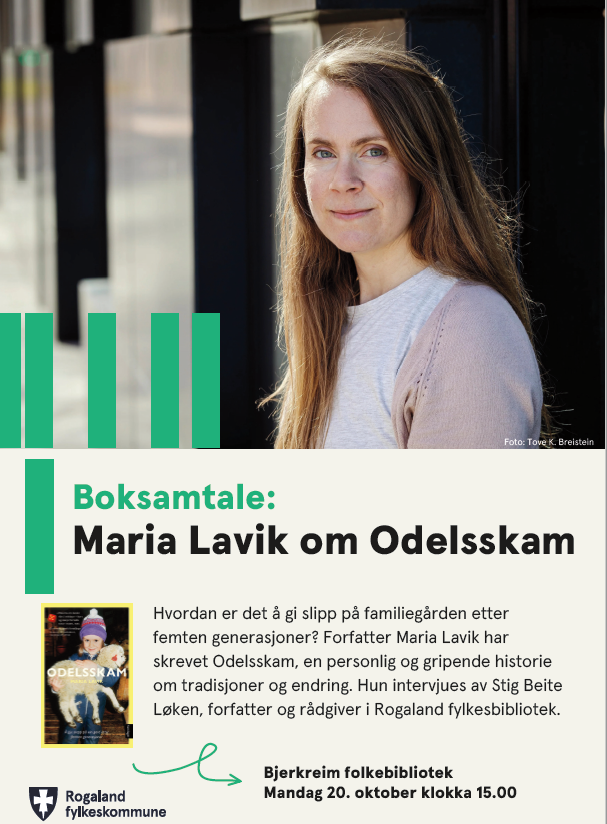 Maria Lavik besøker bibiloteketLavik blir intervjua om boka si «Odelsskam» på biblioteket mandag 20. oktober klokka 15.00Arrangementet er gratis og åpent for alle. Velkommen! Publisert av Bjørn Egil Gilje Publisert 13.10.2025 08.27 Sist endret 13.10.2025 08.27
